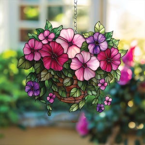 Petunia Basket Acrylic Suncatcher – Faux Stained Glass Window Hanging with Pink and Purple Flowers, Garden Window Decor or Gift for Mom