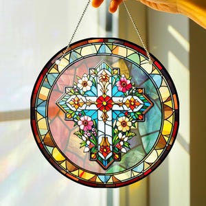 Stained Glass Cross Wildflowers Suncatcher – Flower Cross Gift For Religious Easter Faith Cross Home Decor – Christian Glass Windows Hanging